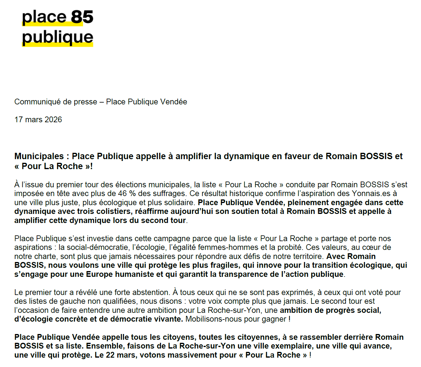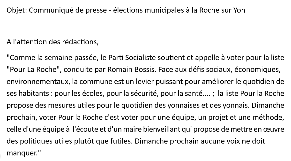 Depuis 2 semaines, les soutiens à notre liste Pour la Roche se multiplient dans la presse et nous sommes heureux de vous partager les communiqués de presse des 4 partis de gauche et des écologistes qui appuient notre candidat Romain Bossis et le programme que nous portons (la presse n’ayant pas pu reprendre leur intégralité dans leurs articles).